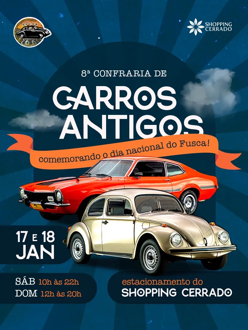 A 8ª Confraria de Carros Antigos acontece neste fim de semana, 17 e 18 de janeiro, no Shopping Cerrado, em comemoração ao Dia Nacional do Fusca, que acontece no dia 20 de janeiro. Realizado em parceria com a APCAR – Associação dos Proprietários de Carros Antigos, o evento deve reunir cerca de 800 veículos de 30 clubes diferentes no estacionamento principal e subsolo do mall. A programação, que é considerada a maior iniciativa do segmento no Centro-Oeste e figura entre as maiores do país, tem entrada franca.