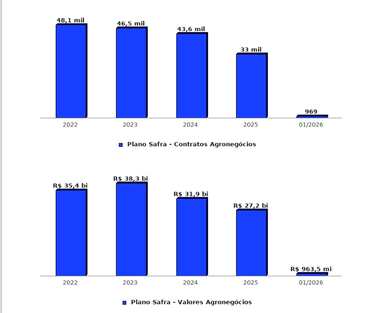 Em nível estadual, os dados do Plano Safra mostram trajetória de redução nos valores concedidos desde o recorde em 2023. Naquele ano, Goiás registrou R$ 38,3 bilhões em 48,1 mil contratos de agronegócio. Em 2022, foram R$ 35,4 bilhões em 46,5 mil contratos. Já em 2024, o volume caiu para R$ 31,9 bilhões em 43,6 mil contratos.