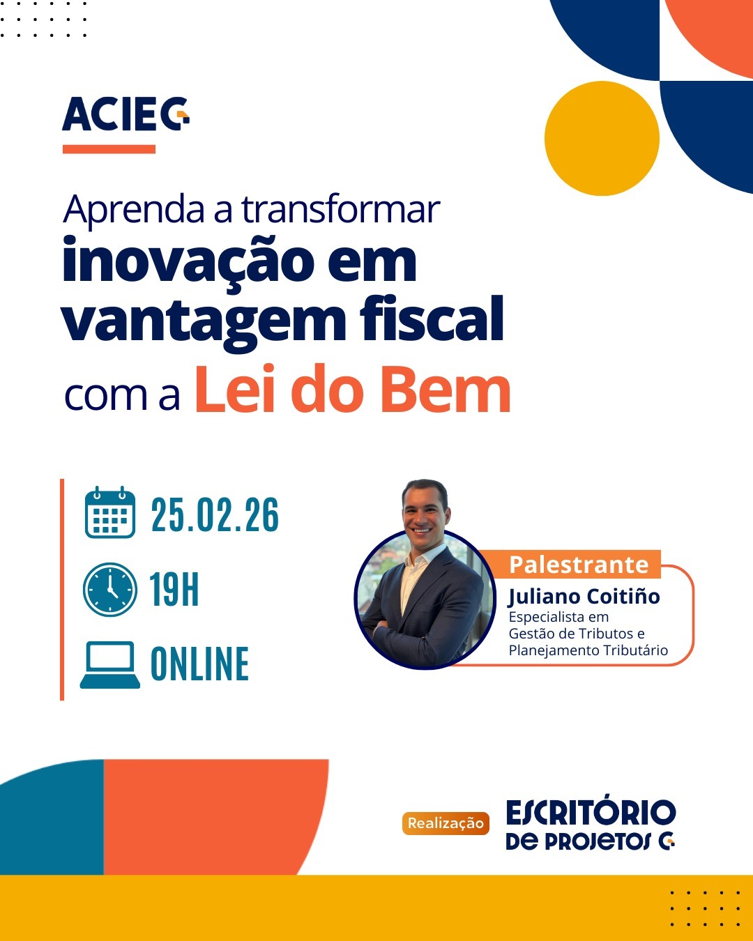 A ACIEG convida você para um encontro online, dia 25 de fevereiro, às 19h, sobre a Lei do Bem, um dos principais instrumentos de incentivo fiscal para empresas que investem em inovação no Brasil.