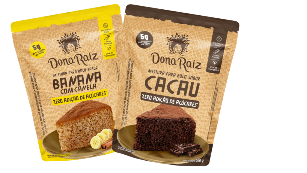 A Dona Raiz apresenta sua nova mistura para bolo 0 açúcar, disponível nos sabores Banana com Canela e Cacau. O diferencial do produto está na combinação dos sabores tradicionais da marca com uma formulação enriquecida em proteínas, sem adição de açúcares.