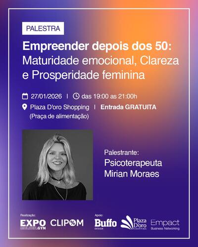 O Plaza D’Oro Shopping, em Goiânia, será palco da palestra “Empreender depois dos 50: maturidade emocional, clareza e prosperidade feminina”, que acontece nesta terça-feira (27), das 19h às 21h. Com entrada gratuita, o encontro é voltado principalmente para mulheres a partir dos 50 anos que desejam empreender, recomeçar ou fortalecer seus projetos profissionais de forma mais consciente e emocionalmente saudável.