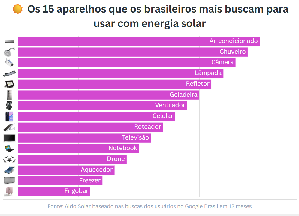 Os benefícios, como economia a longo prazo e a portabilidade do sistema, têm impulsionado o interesse pela instalação de painéis solares. Nos últimos 12 meses,cerca de 600 mil pesquisas foram registradas no Google Brasil por termos relacionados a eletrodomésticos e eletrônicos movidos a energia solar, de acordo com levantamento da Aldo Solar, maior distribuidora de energia solar do Brasil.