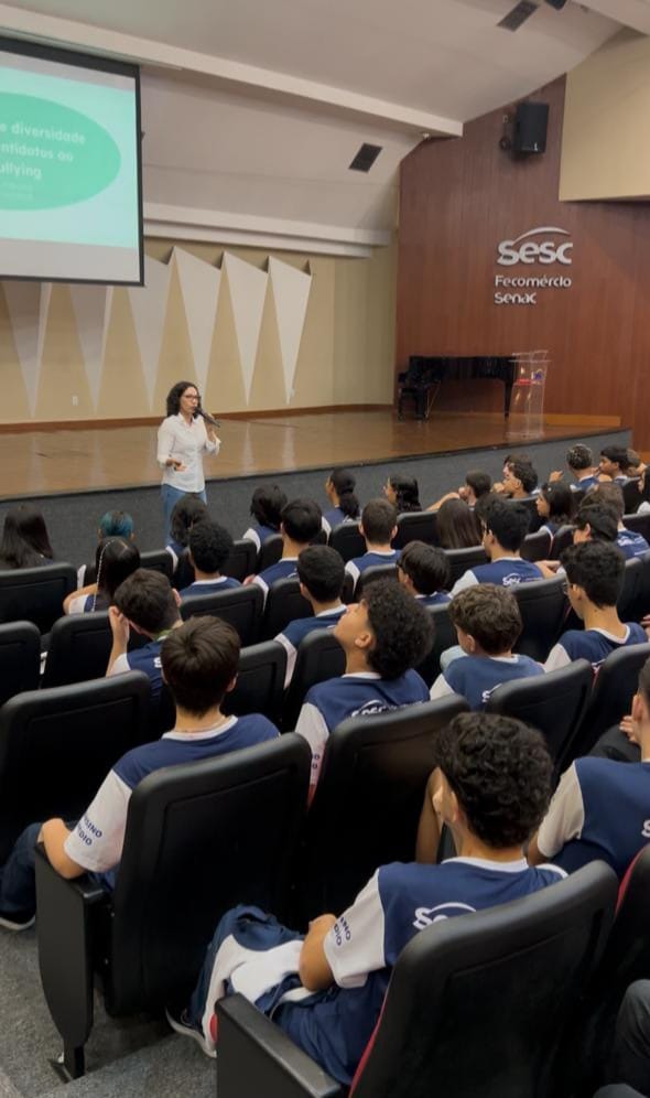 Alunos do 1º e 2º ano do Sesc Cidadania, em Goiânia, participaram de uma palestra interativa que abordou inclusão e Diversidade como ferramentas para combater o bullying no ambiente escolar. Cerca de 350 estudantes do ensino médio estiveram presentes na atividade, ministrada por Leandra Ferreira, ex-professora da unidade.