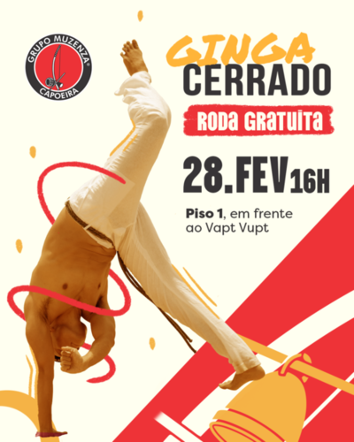 Neste sábado (28), a partir das 16h, a Capoeira vai tomar conta do Shopping Cerrado com o Ginga Cerrado. O evento, promovido em parceria com o Grupo Muzenza de Capoeira, vai contar com roda de capoeira, aulão para iniciantes, samba de roda e maculelê.