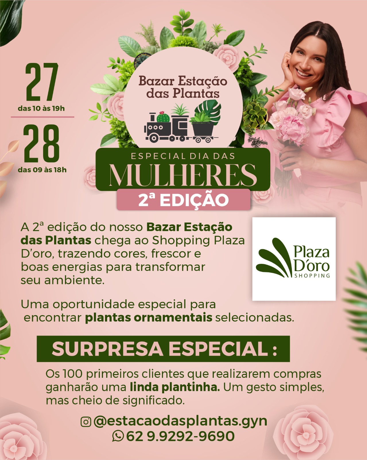O Plaza D’oro Shopping recebe, nos dias 27 e 28 de março (sexta e sábado), a 2ª edição do Bazar Estação das Plantas, evento que reúne produtores e colecionadores especializados em espécies ornamentais e jardinagem. Voltado para todos os públicos, o bazar traz uma grande variedade de plantas para quem deseja transformar ou renovar ambientes com mais verde e bem-estar. O evento acontece na área de eventos do centro de compras, das 10h às 19h na sexta-feira, e das 9h às 18h no sábado.